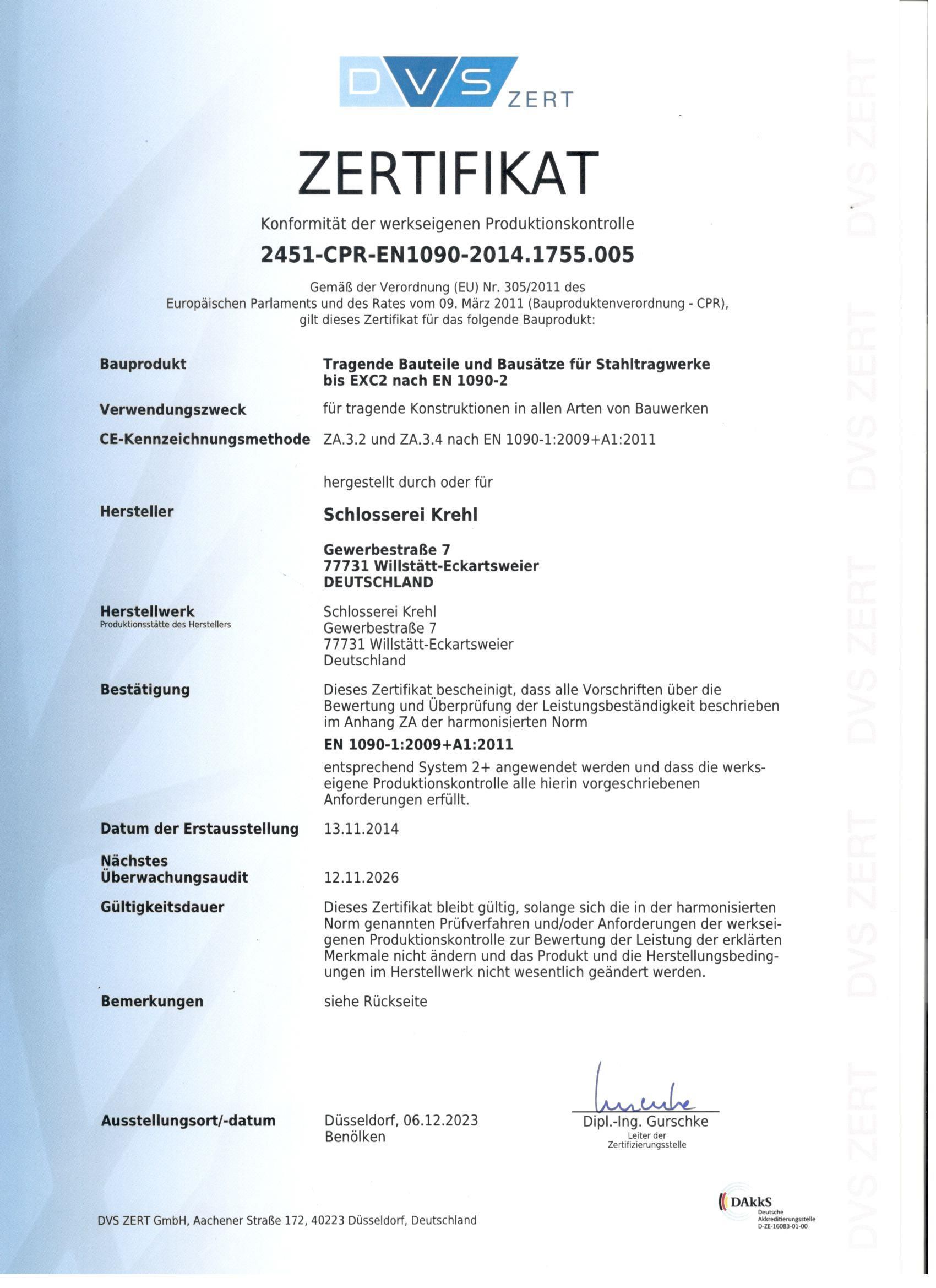 Zur Herstellung und Inverkehrbringung der Produkte ist die Zertifizierung nach EN-1090 zwingend erforderlich.